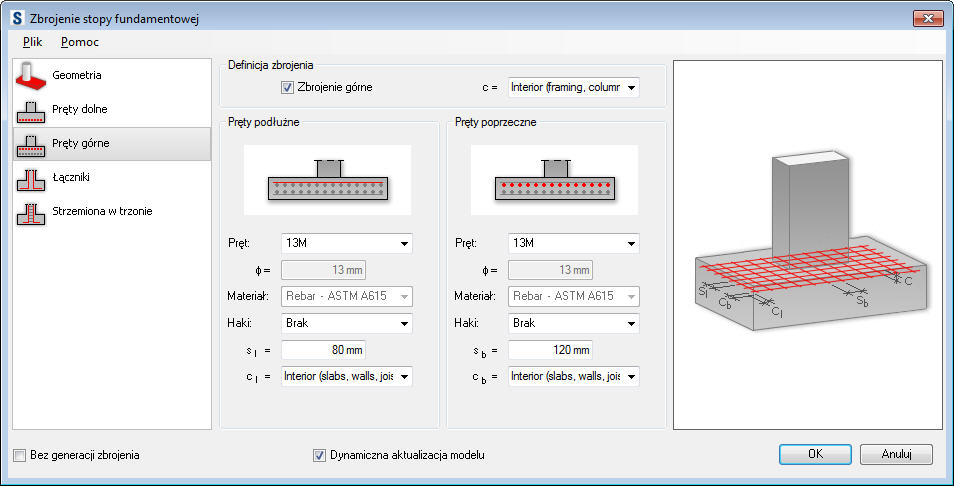 Aby wygenerować zbrojenie górne w stopie fundamentowej, w polu Definicja zbrojenia należy wybrać pozycję Zbrojenie górne. Następnie można zdefiniować parametry zbrojenia górnego:
