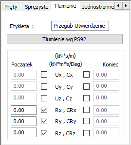 Definicja zwolnienia z tłumieniem polega na podaniu etykiety zwolnienia, wyborze zablokowanych stopni swobody na początku oraz końcu elementu pręta oraz podaniu wartości współczynników tłumienia CX, CY, CZ, CRX, CRY, CRZ (są to składowe macierzy tłumienia C). Liczba dostępnych współczynników tłumienia zależy od wybranego typu konstrukcji (rama 2D, kratownica 3D, płyta itp.). Tak zdefiniowana wartość tłumienia jest brana pod uwagę jedynie w analizie równań ruchu (Analiza Czasowa). Wartość tłumienia jest brana pod uwagę jedynie w całkowaniu równań ruchu