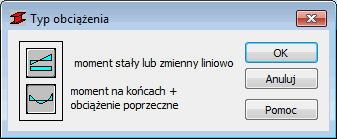 W trakcie obliczeń automatycznych, gdy charakter obciążenia zmienia się przy zmianie przypadku obciążeniowego, przyjmowana jest domyślnie opcja Stały moment, Liniowo. W chwili ręcznego wyboru przypadku obliczeniowego lub wpisywania wartości sił wewnętrznych istnieje możliwość dokładnego określenia charakteru obciążenia.