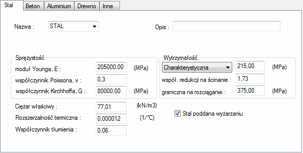 - Współczynnik tłumienia — współczynnik tłumienia dla definiowanej stali (jest to tłumienie materiałowe określane dla potrzeb analiz dynamicznych konstrukcji).