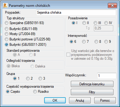 Parametry analizy sejsmicznej konstrukcji zależą od wyboru normy sejsmicznej, która będzie wykorzystywana podczas obliczeń konstrukcji poddanej wpływom obciążeń sejsmicznych. Należy wybrać chińskie normy sejsmiczne w oknie dialogowym Definicja nowego przypadku lub nacisnąć przycisk Parametry w oknie dialogowym Typ analizy.