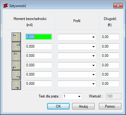 Po wybraniu numeru pręta dochodzącego w dolnej części okna dialogowego sprawdzana jest wartość współczynnika wyboczeniowego, a w polu Test dla pręta: Wartość podawana jest wartość wyznaczonego przez program współczynnika wyboczenia.