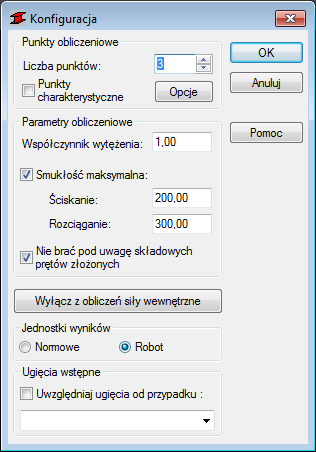 W środkowej części okna dialogowego znajduje się przycisk Wyłącz z obliczeń siły wewnętrzne, którego naciśnięcie powoduje otwarcie dodatkowego okna dialogowego Wyłączenie sił wewnętrznych; w oknie tym określone mogą zostać graniczne wartości sił wewnętrznych (pozwala to na pominięcie „nieistotnych” wartości sił dla konkretnego przekroju). Ponadto wybrane mogą zostać jednostki prezentacji wyników wymiarowania prętów. Wyniki mogą być prezentowane w jednostkach używanych w wybranej normie stalowej lub stosowanych w programie Robot.