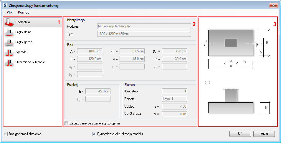 Okno dialogowe Zbrojenie stopy fundamentowej jest podzielone na trzy główne części: