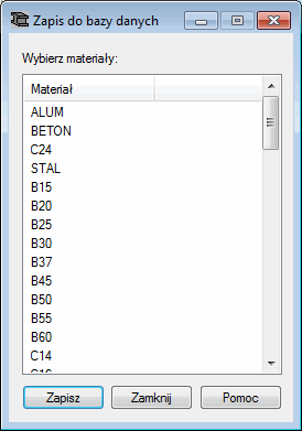 W środkowej części okna dialogowego znajduje się lista materiałów zdefiniowanych w programie Robot. Przy wejściu do tego okna dialogowego podświetlane są wszystkie materiały, które nie są zapisane w bazie. Naciśnięcie klawisza Zapisz powoduje zapisanie wybranych materiałów do aktualnej bazy materiałów.
