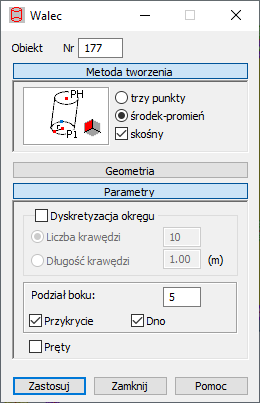 - Przykrycie — Włączenie tej opcji powoduje, że w trakcie definiowania walca tworzona będzie również ścianka obiektu będąca jego przykryciem.