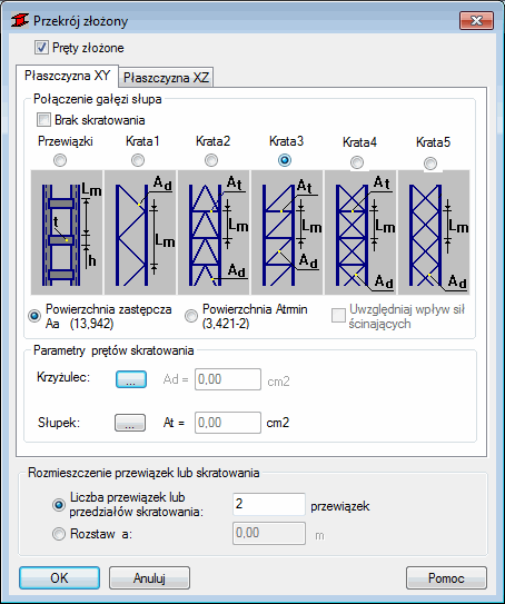Założono, że odpowiednie płaszczyzny przewiązek (skratowania) są równoległe do lokalnych osi przekroju wielogałęziowego (x — oś podłużna pręta, y — oś pozioma, z — oś pionowa). Na karcie Płaszczyzna XY istnieje możliwość zdefiniowania typów przewiązek lub skratowania leżących w płaszczyźnie równoległej do lokalnej osi y. Analogicznie na karcie Płaszczyzna XZ definiowane będą parametry przewiązek lub skratowania leżących w płaszczyźnie równoległej do lokalnej osi z. Włączenie opcji Brak skratowania powoduje, że w obliczeniach nie jest uwzględniana ‘wielogałęziowość’ i obliczenia przeprowadzane są przy założeniu pełnego zespolenia gałęzi w danej płaszczyźnie.