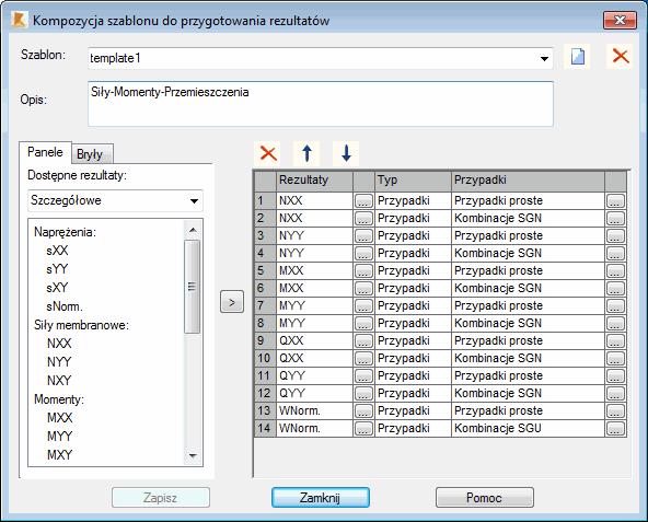 Po naciśnięciu przycisku > znajdującego się na karcie Panele lub Bryły można przenieść prezentowane wyniki do zdefiniowanego szablonu.