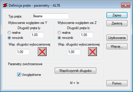 W polu Współczynnik długości wyboczeniowej określone mogą zostać współczynniki długości wyboczeniowej pręta w obydwu kierunkach. W odpowiednie pola wpisywana jest automatycznie rzeczywista długość pręta (ew. suma długości prętów składowych).