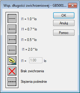 Opcja ta jest używana do definiowania odpowiednich odległości między przekrojami prętów zabezpieczonymi przed zwichrzeniem, tj. długości zwichrzeniowej. Opcja ta staje się dostępna po naciśnięciu jednego z poniższych przycisków: górna i dolna półka w polu Parametry zwichrzeniowe w oknie Definicja pręta — Parametry.