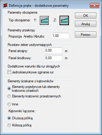Po włączeniu tej opcji możliwa staje się definicja elementów z kątowników w konstrukcji oraz sposobu ich połączenia z blachą węzłową. W zależności od wybranej opcji program Robot oblicza smukłość zastępczą elementu ściskanego zgodnie z punktem 13.3.3. W ten sposób obliczana smukłość będzie używana do sprawdzania wyboczenia dla kierunków Y i Z.