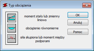 W trakcie obliczeń automatycznych charakter obciążenia zmienia się wraz ze zmianą przypadku obciążenia. W przypadku obliczeń automatycznych domyślną opcją jest moment stały lub zmienny liniowo. W momencie ręcznego wyboru przypadku obliczeniowego lub wpisywania wartości sił wewnętrznych istnieje możliwość dokładnego określenia charakteru obciążenia.