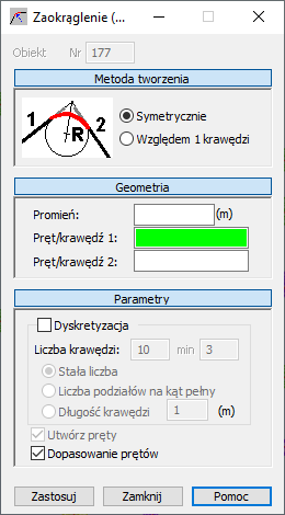 - Pręt/krawędź 2 — określa numer drugiego pręta/krawędzi, której położenie będzie definiować zaokrąglenie.
