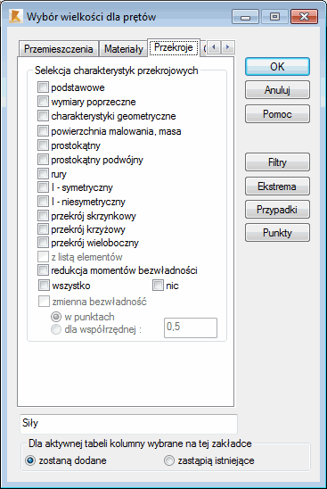 W tym oknie do prezentacji mogą zostać wybrane następujące informacje o przekrojach prętów:
