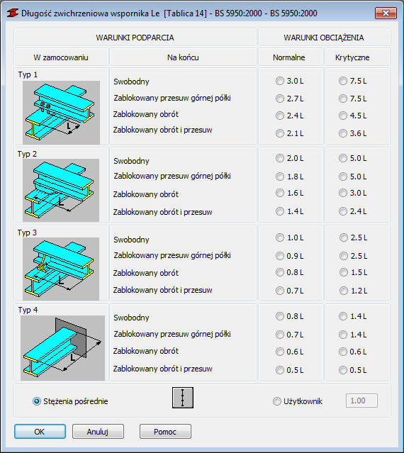 Okno dialogowe prezentuje Tabelę 14, zawartą w normie BS5950: 2000.