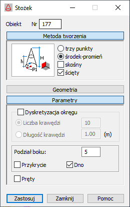 - Przykrycie — włączenie tej opcji powoduje, że w trakcie definiowania stożka tworzona będzie również ścianka obiektu będąca jego przykrycie. Opcja dostępna jest jedynie dla stożka ściętego.