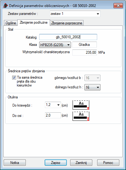 Karta Zbrojenie podłużne okna dialogowego Definicja parametrów obliczeniowych dla chińskiej normy GB 50010-2002 przedstawiona jest na poniższym rysunku.