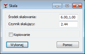 Po wybraniu opcji Edycja/Skalowanie należy zdefiniować środek i mnożnik skalowania (graficznie na ekranie lub wpisując wartości w odpowiednich polach edycyjnych okna dialogowego pokazanego poniżej).