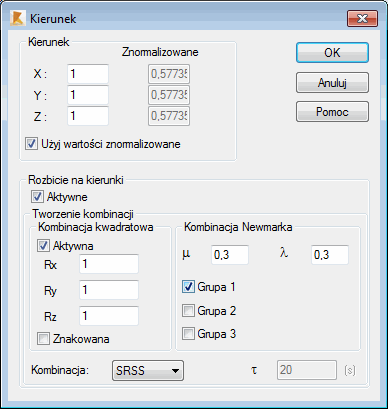 Na ekranie pojawia się pokazane poniżej okno. Opcja Rozbicie przypadku sejsmicznego/spektralnego na kierunki pozwala na automatyczną generację trzech przypadków sejsmicznych różniących się kierunkiem wymuszenia. Kierunek wymuszenia (X, Y, Z) zdefiniowany w górnej części okna dialogowego będzie poprawnie wyznaczony w przypadku (X, Y) (0, 0, 0, 0), (0, 0, Z). Nazwy nowo utworzonych przypadków zawierają informacje, wskazujące w jakim kierunku występuje zdefiniowane wymuszenie. Dlatego wartości zdefiniowane w polach X, Y, Z są komponentami wektoru wymuszenia. Wybierz opcję Użyj znormalizowanych wartości do skalowania wartości komponentów, tak aby powstały wektor był wektorem jednostkowym.