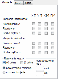 Teoretyczne powierzchnie zbrojenia oraz rozstawy zbrojenia otrzymane podczas wymiarowania konstrukcji płytowych/powłokowych mogą być prezentowane również w postaci krzyży zbrojenia. Rozdzielone zostało rysowanie krzyży dla górnego i dolnego zbrojenia. Wartości określające segmenty krzyżowe górnego zbrojenia są rysowane na dodatniej osi (↑ →). Te wartości określające dolne zbrojenie są rysowane na ujemnych wartościach osi (← ↓). Dzięki temu można włączyć jednoczesne rysowanie krzyży dla górnego i dolnego zbrojenia.
