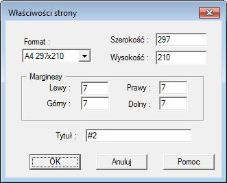 Okno Właściwości strony pokazane poniżej pozwala ustawić parametry strony. Okno to może zostać otwarte: