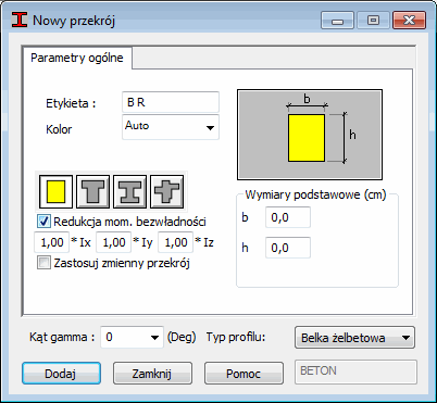 Przykładowo dla belki żelbetowej okno dialogowe Nowy przekrój przybiera postać pokazaną na poniższym rysunku.