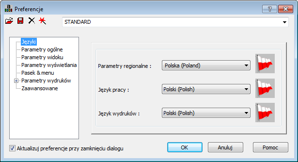 Po wyborze opcji Języki w oknie Preferencje istnieje możliwość wyboru parametrów regionalnych i wykorzystywanego w programie języka.