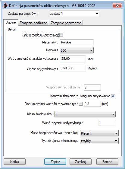 Karta Ogólne okna dialogowego Definicja parametrów obliczeniowych dla chińskiej normy GB 50010-2002 przedstawiona jest na poniższym rysunku.