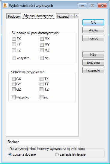 - MX, MY, MZ — jeśli wybrane, do tabeli dodane zostają kolumny dla momentów pseudostatycznych odpowiednio MX, MY i MZ, uzyskanych podczas analizy konstrukcji (siły podane w lokalnym układzie współrzędnych pręta).