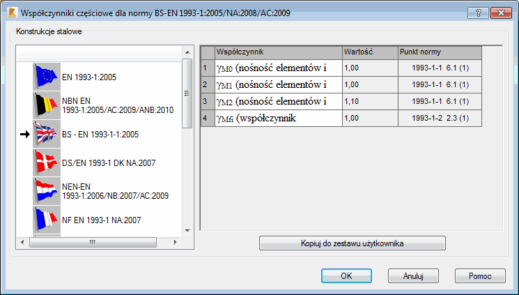Aby utworzyć zestaw użytkownika, należy nacisnąć przycisk Kopiuj do zestawu użytkownika. Do pól edycyjnych znajdujących się na karcie zdefiniowanej przez Użytkownika są kopiowane wartości współczynników z wybranej/aktywnej normy Eurocode. Przycisk Kopiuj do zestawu użytkownika nie jest dostępny na karcie Użytkownika.