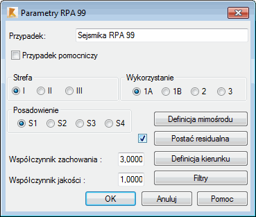 Parametry analizy sejsmicznej konstrukcji zależą od wyboru normy sejsmicznej, która będzie wykorzystywana podczas obliczeń konstrukcji poddanej wpływom obciążeń sejsmicznych. Po wyborze algierskiej normy sejsmicznej RPA 99 lub RPA 99 (2003) w oknie dialogowym Definicja nowego przypadku lub naciśnięciu przycisku Parametry w oknie Typ analizy na ekranie pojawia się okno dialogowe pokazane poniżej.