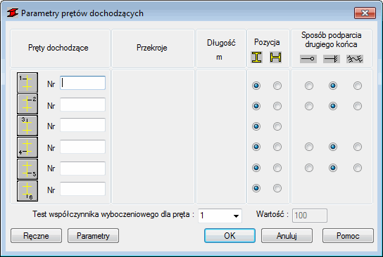 Aby zdefiniować parametry prętów dochodzących w celu obliczenia współczynnika wyboczeniowego pręta głównego, należy kliknąć ikonę znajdującą się w oknie dialogowym Schematy wyboczeniowe.