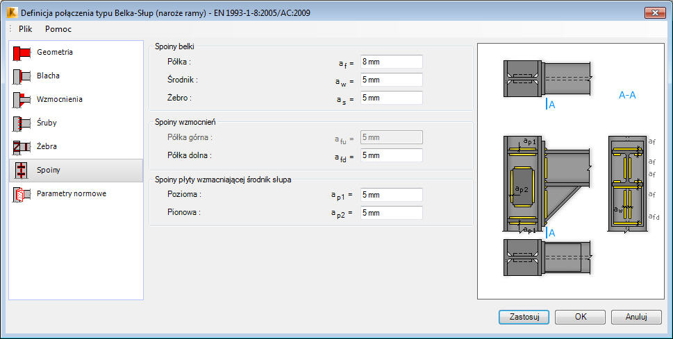 W zakładce Spoiny znajdują się opcje pozwalające na definiowanie grubości spoin łączących belkę z blachą doczołową oraz spoin łączących żebra oraz blachę wzmacniającą środnik słupa.