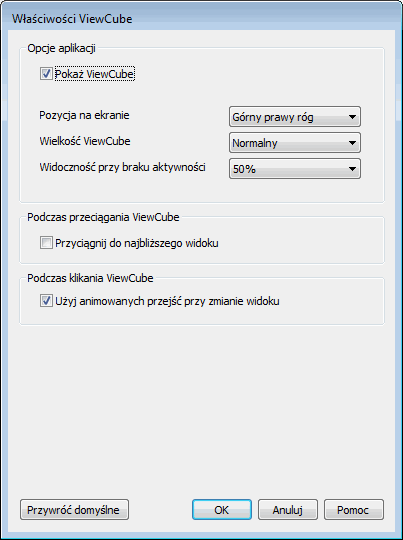 Opcja służy do sterowania wyglądem narzędzia ViewCube. Opcja dostępna w menu poprzez wybranie polecenia Widok / ViewCube — właściwości. Po wybraniu tej opcji na ekranie pojawia się pokazane poniżej okno.