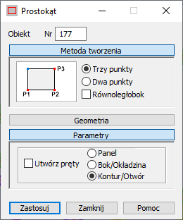 - Panel — po wybraniu tej opcji, prostokąt jest definiowany jako panel z domyślnymi parametrami. Numer i takie właściwości panelu jak: typ zbrojenia i grubość są przypisane domyślnie.