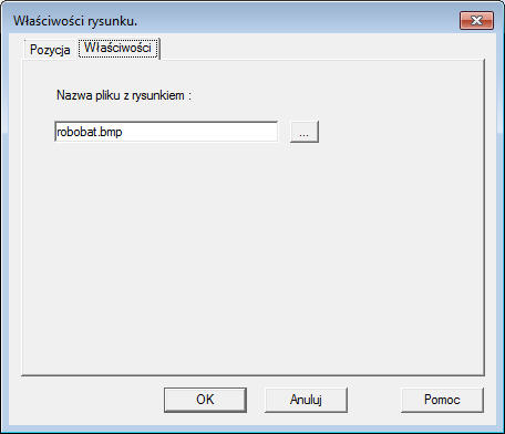 Karta Właściwości wyświetlana na rysunku powyżej umożliwia wybranie pliku zawierającego wymagany rysunek (dopuszczalne są dwa formaty plików: *.bmp i *wmf).