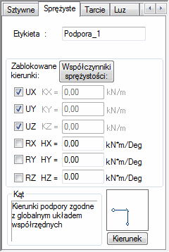 W prawym, dolnym rogu okna przedstawiany jest schematyczny rysunek definiowanej podpory. Pod rysunkiem znajduje się przycisk Kierunek; jego naciśnięcie powoduje otwarcie okna dialogowego Kierunek podpory, w którym zdefiniowany może zostać kierunek lokalnej osi x podpory. Kierunek osi jest określany poprzez skierowanie go do punktu, węzła lub obrócenie podpory względem dowolnej osi globalnego układu współrzędnych.