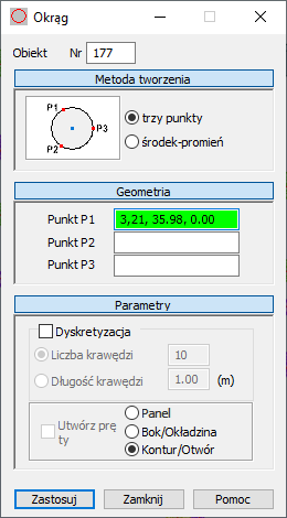 W części okna dialogowego nazwanej Geometria znajdują się 3 pola edycyjne, w których należy podać współrzędne punktów P1, P2 i P3. Znaczenie tych punktów zależy od wybranej metody tworzenia okręgu.