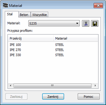 Przy nadawaniu prętom konstrukcji przekrojów przypisywany jest im jednocześnie materiał.