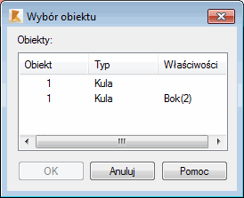 Czasami, szczególnie podczas projektowania dużej konstrukcji, trudno jest wybrać elementy za pomocą myszy. Okno dialogowe Wybór obiektu pozwala dokładnie określić element, który użytkownik chce wybrać.
