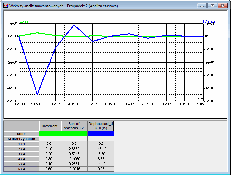W przypadkach analizy nieliniowej tylko wynik przyrostu od ostatniego wczytania jest zapisywany jako domyślny. W takim przypadku wykresy nie będą dostępne. Opcja "Zapisz wyniki po każdym przyroście" powinna być aktywna dla nieliniowej analizy w oknie dialogowym Analiza / Typy analizy w celu zapisu wyników dla każdego przyrostu.
