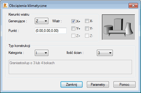 Po określeniu podstawowych parametrów konstrukcji obrotowo—symetrycznej i naciśnięciu przycisku Parametry na ekranie otwierane jest okno dialogowe umożliwiające definicję parametrów obciążenia wiatrem.