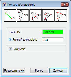 Jeżeli włączona jest opcja Relatywnie, to podczas definicji wielokąta współrzędne kolejnego wierzchołka będą liczone względem położenia poprzedniego wierzchołka. Jeżeli ta opcja jest wyłączona, to współrzędne wierzchołków wielokąta będą podawane w przyjętym układzie współrzędnych.