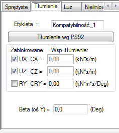 Na karcie Tłumienie można zdefiniować typ kompatybilności z uwzględnieniem tłumienia. Współczynniki CX, CY, CZ, CRX, CRY, CRZ (są to składowe macierzy tłumienia C) mają taki sam sens jak w przypadku definicji podpór sprężystych. Liczba dostępnych współczynników tłumienia zależy od wybranego typu konstrukcji (rama 2D, kratownica 3D, płyta itp.). Tak zdefiniowana wartość tłumienia jest brana pod uwagę jedynie w analizie równań ruchu (analiza czasowa).