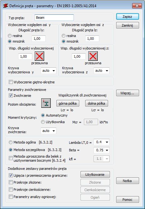 - Dostępne są opcje używane podczas weryfikacji zwichrzenia pręta: typ zwichrzenia, poziom obciążenia, moment krytyczny i współczynnik długości zwichrzeniowej.