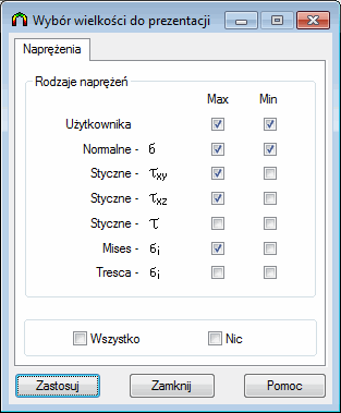 Do prezentacji wybrane mogą być minimalne i maksymalne wartości dla wszystkich dostępnych typów naprężeń oraz dla naprężeń użytkownika.