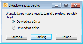 W powyższym oknie dialogowym może zostać wybrana obwiednia (górna lub dolna) wielkości wybranej do prezentacji wybranych przypadków obciążeniowych. Obwiednia dolna lub górna jest prezentowana dla map przedstawianych na konstrukcjach prętowych (ale tylko dla map na prętach), płytowo-powłokowych lub objętościowych.