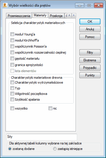 - Współczynnik rozszerzalności cieplnej — jeżeli ta opcja zostanie wybrana, w tabeli pojawi się kolumna, w której prezentowany będzie współczynnik rozszerzalności termicznej materiału dla poszczególnych prętów konstrukcji.