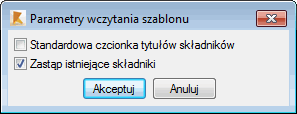W środkowej części okna dialogowego znajduje się również przycisk Wstaw z pliku. Otwarte zostanie niewielkie okno dialogowe. Jeśli Standardowa czcionka Tytułów składników jest nieaktywna (jest to ustawienie domyślne), czcionka tytułów poszczególnych składników wydruku będzie identyczna z czcionką otwartego szablonu. Jeśli jest aktywna, tytuły zostaną wyświetlone z użyciem czcionek zdefiniowanych przez użytkownika w oknie dialogowym Preferencje. Jeśli ta opcja jest włączona, to tytuły będą pokazywane czcionką wybraną w oknie dialogowym Preferencji. Jeżeli opcja Zastąp istniejące składniki jest włączona (jest to domyślne ustawienie), to elementy wybranego szablonu zostaną umieszczone w wydruku, a dotychczasowe elementy wydruku zostaną usunięte.