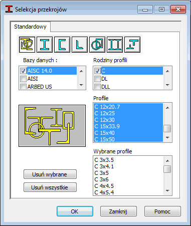 - Przekroje — w tym polu przedstawiane są wszystkie dostępne przekroje z wybranego katalogu i wybranej rodziny